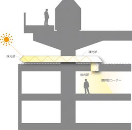 ・概要:日当たりの悪い高架下の建物に太陽光を取り入れた事例。建屋屋上の端と控室の直上までに光ダクトを配置、控室の屋根を開口して天井面で放光。光ダクトは屋外設置のため、2重ダクトとして防水処理。